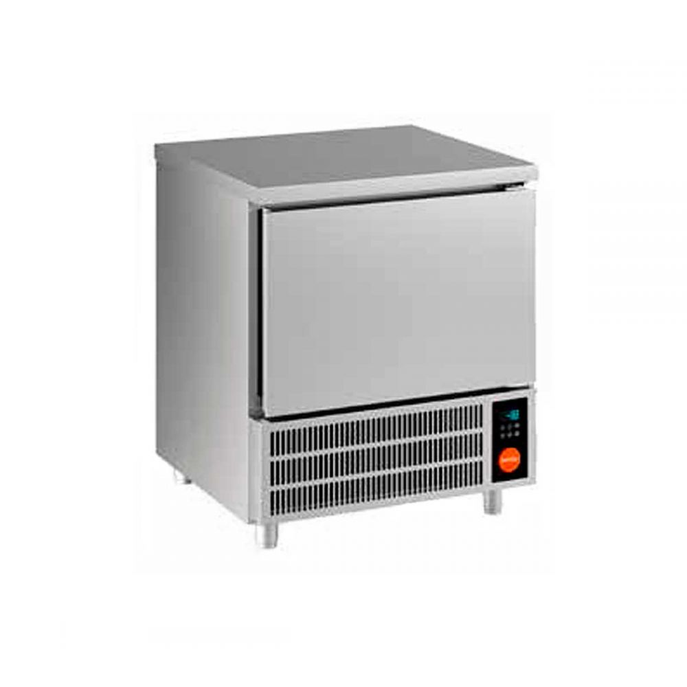 Abatidor Congelador 5 Bandejas 15 Kilos PRIMAX Descripción Ficha Técnica – Abatidor de Temperatura 5 GN 1/1 Construcción: Acero inoxidable AISI 304 Dimensiones del equipo: 79 × 80 × 86 cm Capacidad: 5 bandejas GN 1/1 Abatimiento: 12 kg por ciclo (+90°C a +3°C en 90 minutos) Congelación: 8 kg por ciclo (+90°C a -18°C en 240 minutos) Distancia entre bandejas: 67 mm Inserción de bandejas: Transversal Gas refrigerante: R290 (ecológico) Clase climática: Clase 5 – Tropicalizado (+43°C ambiente) Rango de temperatura: Hasta -31°C Compresor: 3/4 HP Peso neto: 79 kg Peso con embalaje: 91 kg Fabricado en acero inoxidable AISI 304. Interior redondeado. Aislamiento de espuma, poliuretano de alta densidad, 60 mm. Libre de HCFC. Posibilidad de insertar 5 niveles GN1/1, 67 mm altura. Drenaje de agua por el centro. Juntas magnéticas en los 4 lados de la puerta. Portabandejas en acero inoxidable AISI 304, de fácil extracción y limpieza. Microinterruptor que bloquea la ventilación cuando la puerta está abierta. Sonda corazón, incluida. Funciones: Preenfriamiento, enfriamiento SUAVE y DURO, congelación SUAVE y DURO, control de tiempo o con sonda corazón, 9 ciclos preestablecidos modificables, almacenamiento automático al final del ciclo, desescarche manual. Control electrónico semitáctil. Ventiladores de alta presión. Sistema HACCP con almacenamiento de alarmas. Opcional: Comunicación BT o WiFi, con kit especial. Condensación de aire estándar. Evaporador con tratamiento de cataforesis anticorrosión, con múltiples puntos de inyección de gas refrigerante Condensador de alto rendimiento térmico. Compresor hermético de alto rendimiento.