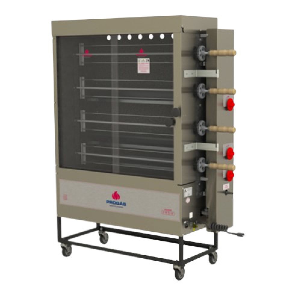 Asadora de Pollos 4 Espadas Progas Acero Estructura en acero inoxidable cepillado Interior Enlozado (limpieza de uno mismo) Los espectadores de vidrio templado frontal Ruedas para facilitar su desplazamiento Grasa bandeja de goteo Equipo 220 watt 50hrz Quemadores Tubulares Alto: 1480 mm Profundidad : 470 mm Ancho: 1130 mm CONSUMO MÉDIO: 0,75 Kg/h GAS Fabricación Brasileña