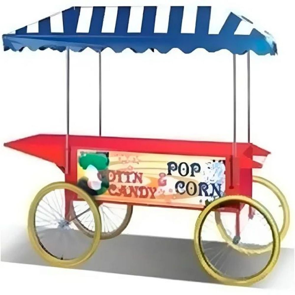 Carro Pop Corn Grande CARRO PARA CABRITAS Y ALGODÓN DE AZÚCAR Posee amplia bodega inferior. Atril inferior porta balón de gas de 5 Kg. Toldo 4 Ruedas Dimensiones: 2080 x 620 x 1720 mm. Peso: 40 Kg.