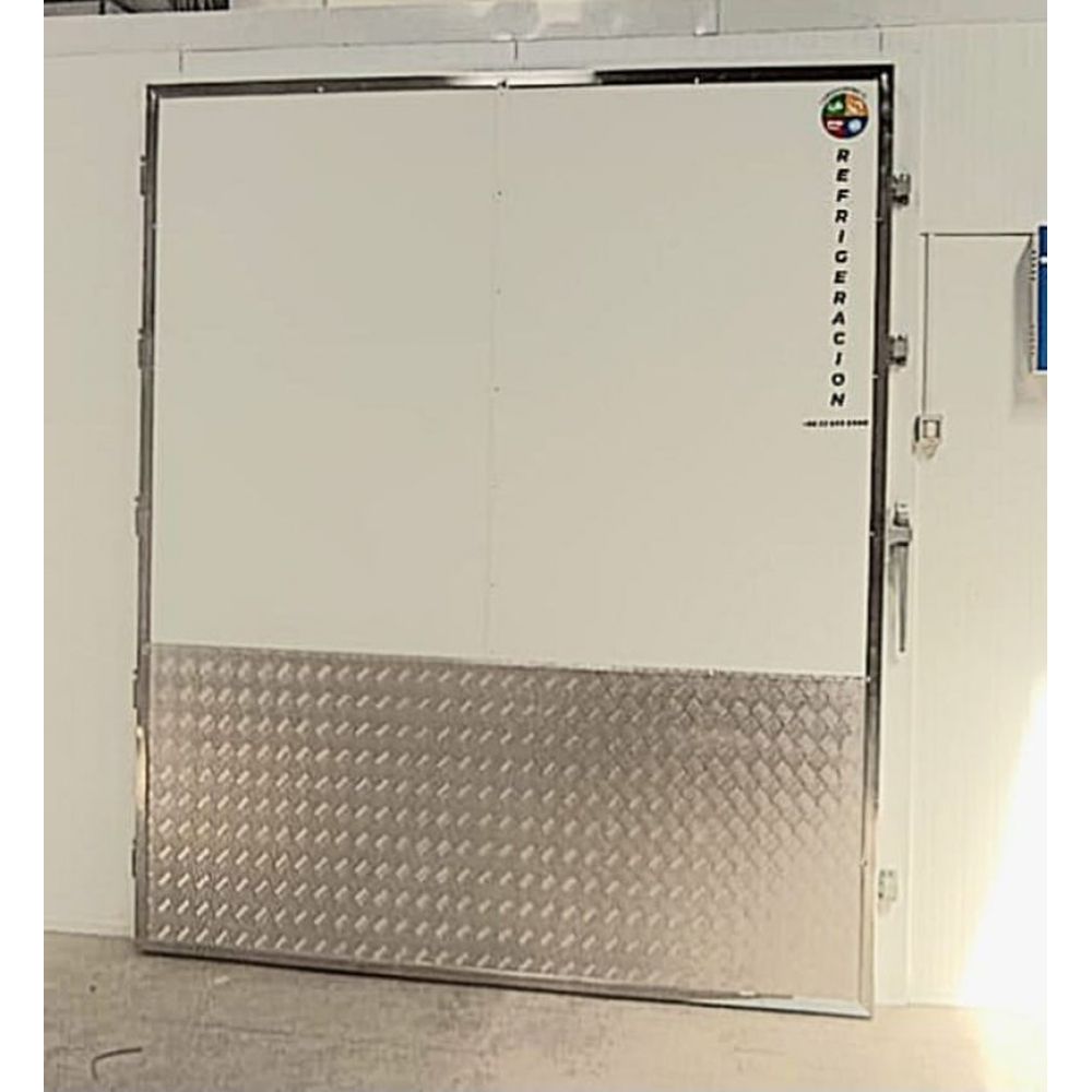 Puerta Abatible Cámara de Congelado 2.30x2.50 Mt Dimensiones Ancho 2.300 mm Alto 2.500 mm Espesor 100 mm. 25 kilos por metro cúbico en poliuretano inyectado Puerta para una temperatura Hasta -5°c Herraje importado en aluminio macizo, con sistema de apreté y apertura interior 4 BisagraS con levanta italianas Marco de contorno de puerta acero esmerilado Marco de acero prepintado de 0.5mm Burlete doble rombo de goma Franja de aluminio diamantado inferior anti golpe