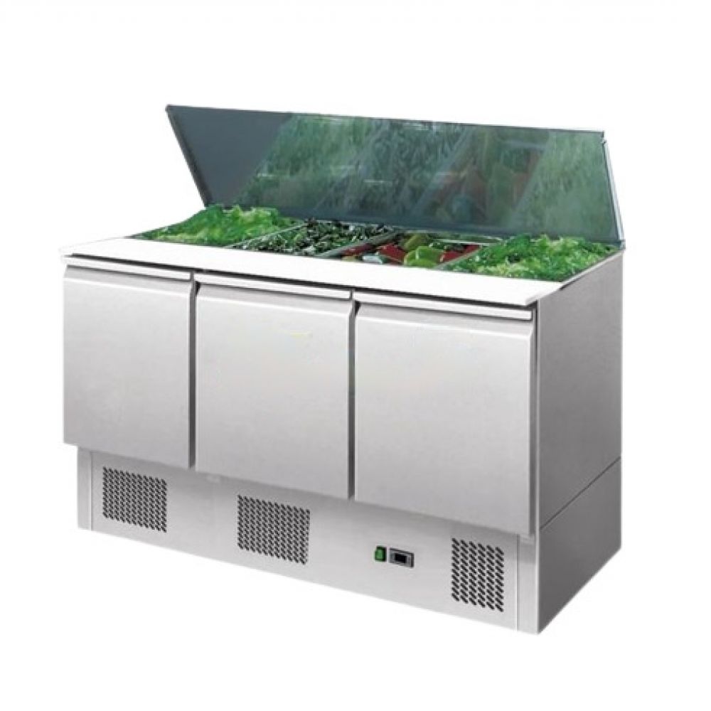 Salsero con Tapa de Acero Elevable de 1.40 Mt Meson Saladtte 3 puertas Acero Inox. tapa alzable Mesón de acero inoxidable VMRSL-385 Para la preparación y refrigeración de productos en estado fresco. Temperatura 2ºC a 10ºC Ideal para restaurante, hoteles, bares y áreas de preparación de comidas. • VMRSL-385 - Sistema de refrigeración con circulación de aire estático. - Sistema ajustable de temperatura interior por termostato digital. - Acabado interior y exterior en acero inoxidable. - Termómetro digital a la vista del público. - Puertas abatibles de acero. - Incluye: Repisas ajustables. - Opcional: Depósitos gastronómicos. Capacidad (lts): 380 Dimensiones (mm): 1365x700x850 Potencia (W): 300 Kw/24Hr: 4,5 Peso neto (Kg): 90 Peso Bruto (Kg): 100