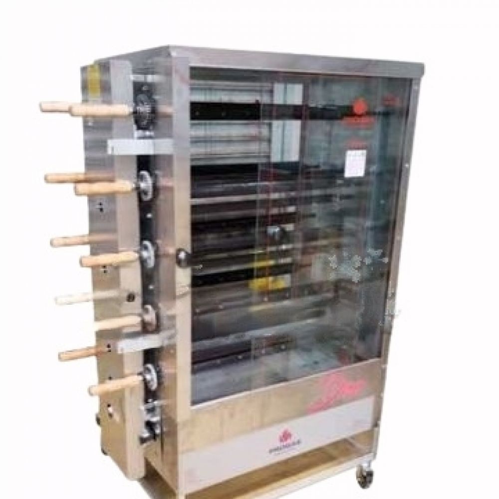 Asadora de pollos 10 espadas PROGAS es ideal para aquellos que necesitan un equipo con una demanda superior en asados, carnes y pollos. Capacidad para 10 pinchos y hasta 100 kg de carne. Estructura exterior de acero inoxidable. Acabado interno en acero galvanizado. Puertas de vidrio templado. Con un cajón de recogida de grasa. 4 ruedas que facilitan el desplazamiento, 2 con pestillo. Control progresivo de llamas. Calefacción a través de quemadores tublares. Modelo: PR-6100 Duo Capacidad: 10 Voltaje: 127/220V Potencia: 360/275W Consumo de gas: 1,49 kg./h Consumo eléctrico: 0,38 kW/h Dimensiones: 1590x1145x650 mm Peso neto: 114kg. Peso bruto: 146,5kg.1183