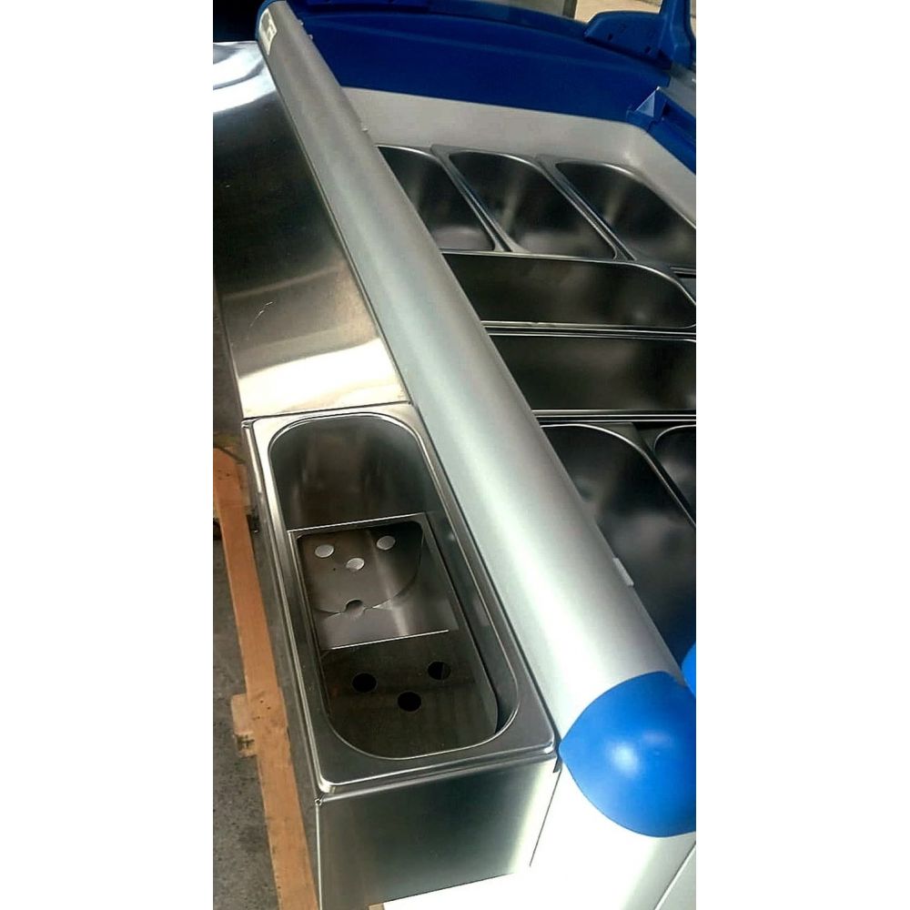 Barquillera 8 Sabores Mimet Sistema de refrigeración 100% de cobre. Tapas deslizables de vidrio templado y baja emisividad LOW-E 0,13 con porta cerradura y llave. Cúpula de vidrios laterales para la exhibición de los productos. Refrigerante R290. Espesor de pared de 70 mm. Marco superior de aluminio anodizado con cabezales de plástico ABS curvos con sistema de anti condensación que evita pérdida de frío. Condensador helicoidal de cobre libre de mantenimiento. Compresor Inverter Temperatura Interior -18º C Capacidad 300 Lt Dimensiones Largo 1160 mm Fondo 610 mm Alto 1420 mm 8 Depósitos Lava cucharas
