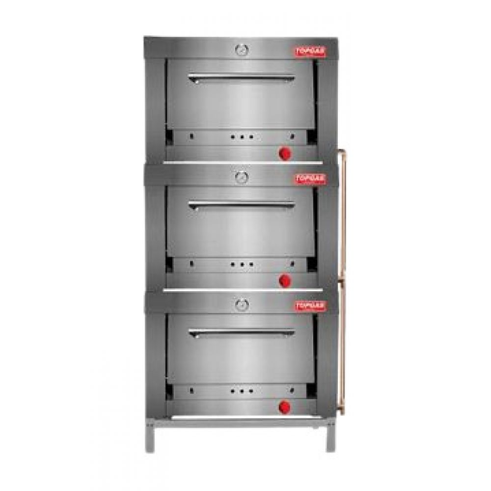 Horno a Gas 3 Camaras Certificado Horno a gas 3 cámaras. Ideales para restaurantes y panaderias. - Construida en acero prepintado. -Frente y camara de acero inoxidable - Cámara de acero enlozado con piso de loza reflactario. - Quemadores de fierro tubular, comandados por llave de gas de tres posiciones. - Termómetro para medir temperatura interna de la cámara. - Incluye atril de acero esmaltado. - Alimentación de gas 1/2”. - Producto certificado. Dimensiones (mm): 900x810x1950 Dimensiones de las bandejas (mm): 650x650 Dimensiones de la cámara (mm): 650x670x290 Peso Atril: 10 kilos Peso Horno: 168.5 Kg. Consumo Nominal: GLP:2.223 G/H GN: 2.297 M3/H Fabricacion Nacional