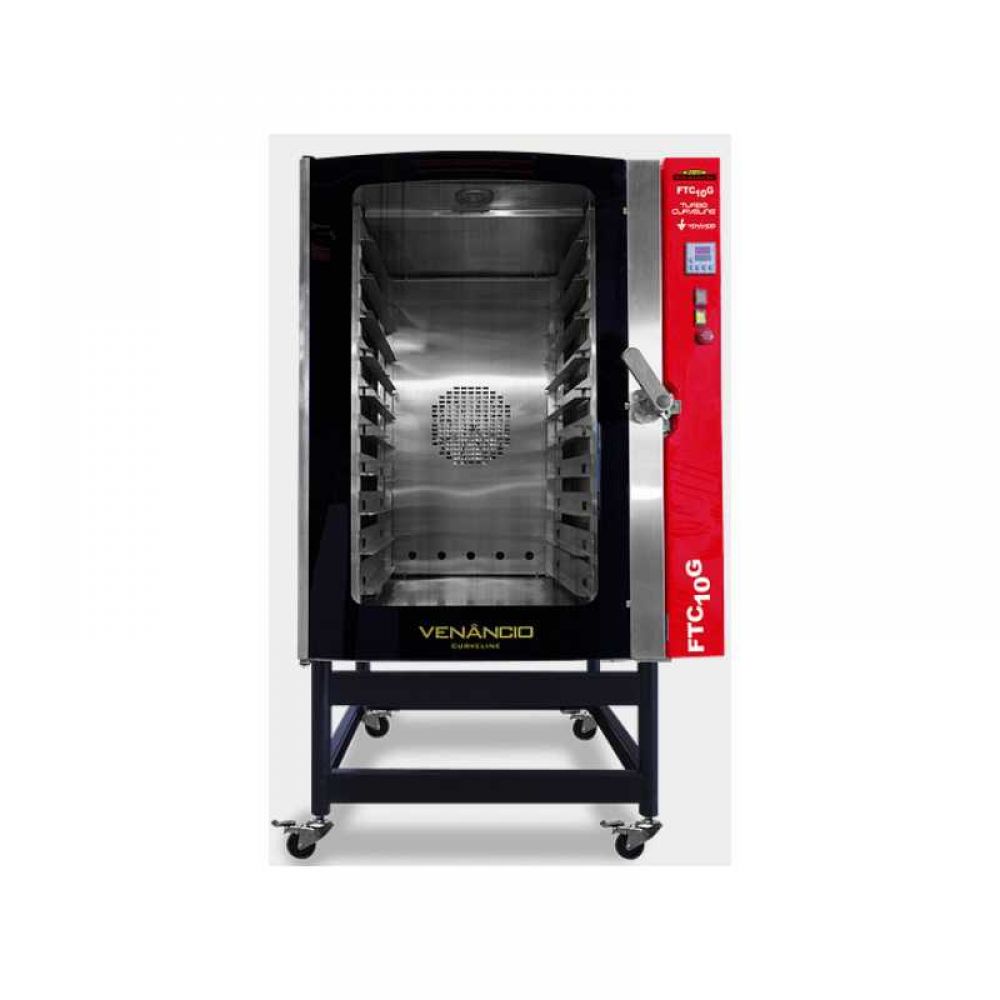 Horno Turbo a Gas 10 Bandejas VENANCIO Kitchenett Flatline HORNOS TURBO Horno a gas de baja presión con 10 bandejas. Panel de control digital, teclas de función general de motor con clave y luz. Puerta de doble vidrio súper resistente totalmente hecha en acero inoxidable cepillado con sistema de regulación de presión en el pomo y bisagra. Manilla en la puerta de acero, el receptor de las puertas cromadas y aislante muy resistente y termoplásticos. Soporte para bandejas de 580 x 680mm en acero inoxidable reforzado. Sistema turbo con hélice especialmente proyectada, permitiendo que el aire circule uniformemente por todo el interior, asando con mayor precision y sin necesidad de virar las bandejas. Laterales, paneles y trasera en acero reforzado, con pintura fabricada de polvo electrostático con base de fosfato. CARACTERÍSTICAS TÉCNICAS Potencia: 28 kW / 31920 kcal/h Energía: 220V / 0.37 kW Consumo: 1.75 kWh Medidas (mm): 1020x1370x1800 (frente x fondo x alto) Peso: 252 Kg Bandejas: 10B 58x68(cm) Producción por bandeja: 2.5 a 3 kg. Certificado por el SEC.