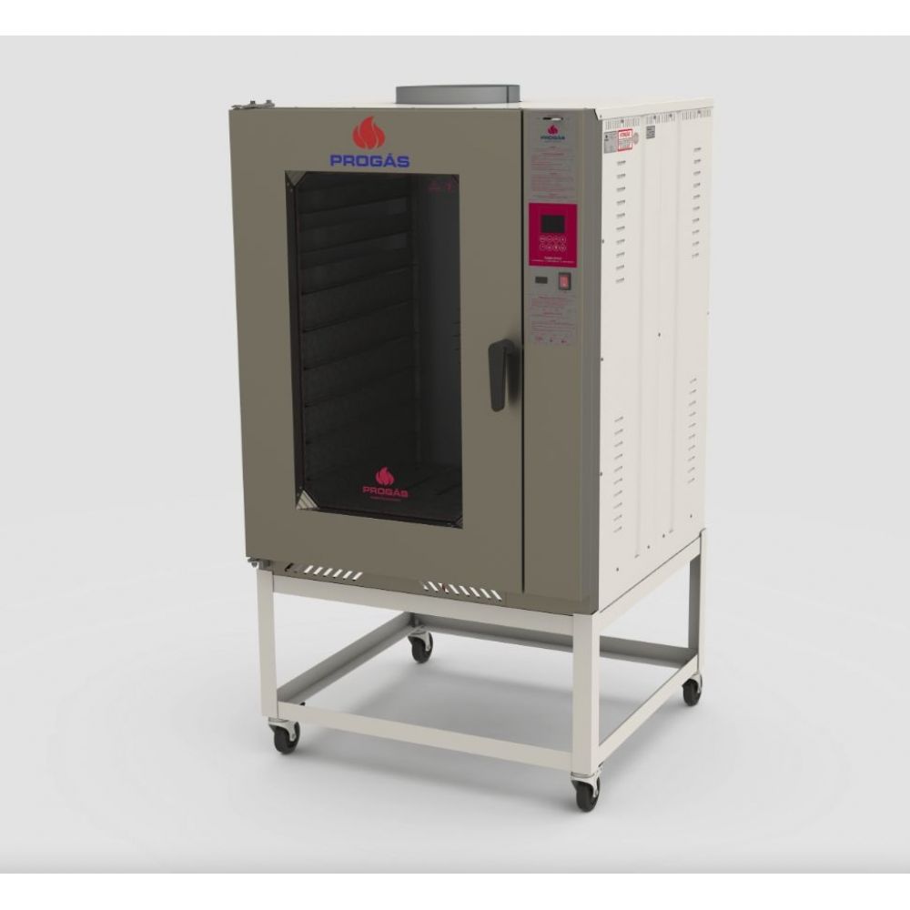 Horno Turbo Convector a Gas 10 Bandejas Progas Descripción del producto Estructura de acero con acabado de pintura epoxi fina; Acabado frontal en acero inoxidable; Aislamiento térmico con lana basáltica; Panel de control con llave general, turbina y lámpara; Micro interruptor que enciende o apaga la turbina al abrir y cerrar la puerta; Ruedas que facilitan el desplazamiento; Tensión monofásica 220 V pantalla de cristal; iluminación interior; Controlador digital para programar tiempo, temperatura y vapor; Bandejas: 10 Enlozadas Certificación SEC Posee un micro-interruptor que conecta o Desconecta la turbina automáticamente Dimensiones: Ancho 970mm, Profundidad 1320mm, Alto 1830mm. Peso 265 Kilos