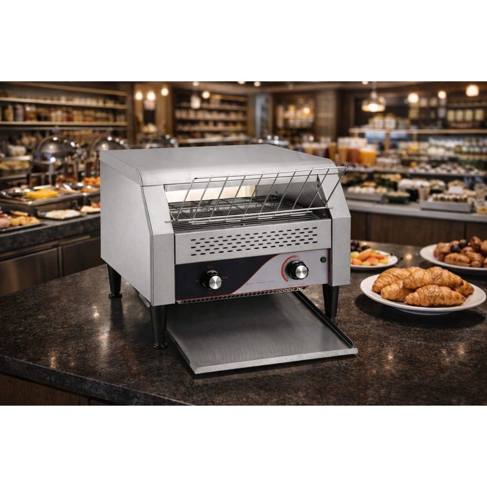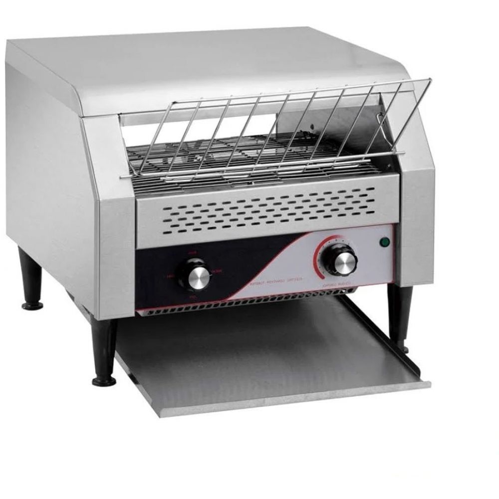 Tostador de Pan Continuo 180 Rebanadas Hora Incluye cinta transportadora Fabricado en acero inoxidable. Regulación de la velocidad de la cinta transportadora para conseguir el tostado deseado. Bandeja recolectora de migas. Posibilidad de salida de la tostada por la parte frontal o por la parte trasera, adaptándose a todo tipo de instalaciones y ubicaciones. Voltaje/frecuencia: 220V/50Hz Potencia: 1300W Dimensiones : Alto 410 mm Largo 420 mm Ancho 390 mm