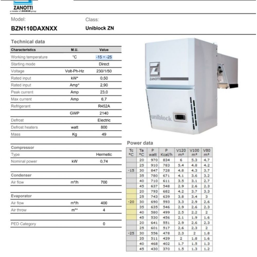 Unidad Monoblock ZANOTTI 1.0 HP 220V -15 a -25 Grados Monoblock 1.0 HP 220V Las unidades Monoblock están diseñadas de forma compacta, de manera que tanto la unidad condensadora como el evaporador se encuentran en la misma estructura, facilitando al máximo su instalación y puesta en servicio. Características: Potencia: 1.0 HP. Refrigerante: R452A Rango temperatura: -15° a -25°. Capacidad (W) 700. Voltaje: 220V.